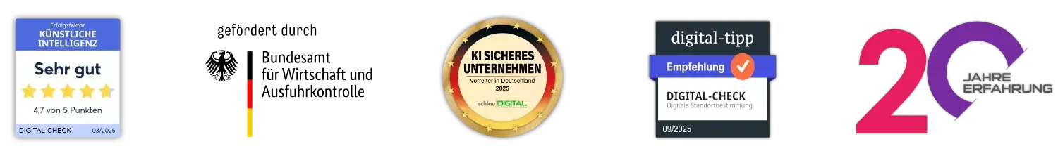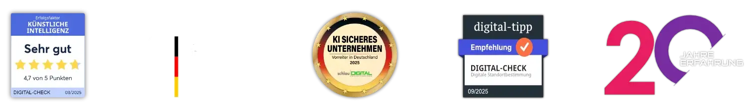Heute bringen wir Unternehmen, Freiberufler und Selbstständige auf die digitale Ăberholspur, um im gerade beginnenden KI-Zeitalter wettbewerbsfähig zu bleiben.